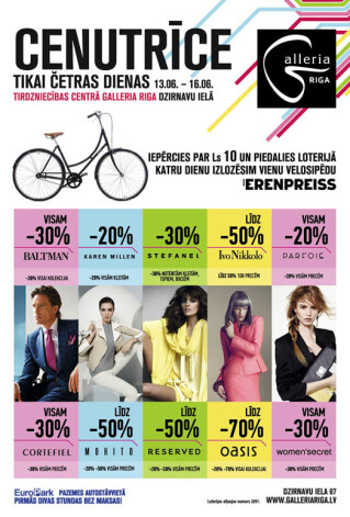 "Cenutrīces" laikā, 13.06.-16.06., pirkumi par Ls 10 vai vairāk piedalās loterijā ar iespēju laimēt stilīgo velosipēdu ERENPREISS vai Ls 20 vērtu dāvanu karti no Galleria Riga veikaliem. Vairāk informācijas šeit.