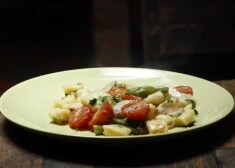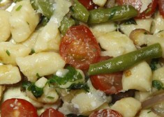 Pannā uzkarsētā olīveļļā apcep sarkano sīpolu, kapātu ķiploka daiviņu, blanšētas (applaucētas) vai saldētas pākšu pupiņas, ķirštomātiņus. Caurjauc tikko vārītiem ņokiem, kas pārkaisīti ar tikko kapātiem zaļumiem (piemēram, pētersīļu lapām) un rīvētu parmezānu vai citu cietu, pikantu sieru. Šim ēdienam labi piestāv arī šķiņķis, kuru, sagrieztu nelielos gabaliņos, pievieno dārzeņiem jau uz pannas.