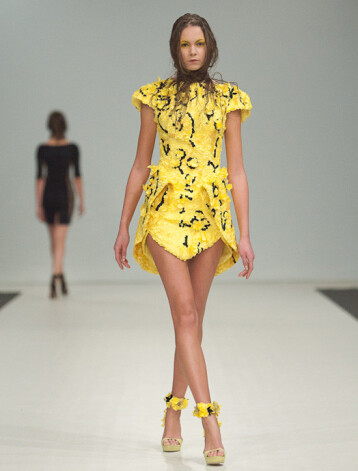 Iedvesmojoties no Šarļa Bodlēra dzejoļiem "Fleurs du Mal”, tos caurvijot ar Van Goga un Frīdas Kahlo mākslas darbiem, FYODOR GOLAN radīja savu 2012. gada pavasara/vasaras kolekciju “Ļaunuma puķes”, kuras centrā ir nimfa, sieviete, kas pārdzīvo sāpīgo metamorfozi, un tveroties pēc atbalsta pie dabas, pakāpeniski ļauj tai pārņemt sevi. Kontrasts starp prāta un fizisko skaistumu, emocionalitāte un izteiksmīgums faunas un floras un mūsdienu sabiedrības tematiku sintēzē. Dizaineru rokrakstu veido tīro līniju un formu integrēšana materiālos un tekstūrā. Mirdzot inkrustētiem dārgakmeņiem, kuri savijas virzienā uz augšu pa muguras izliekumu, couture paņēmieni tika apvienoti ar mūsdienu augsto tehnoloģiju metodēm lāzera griešanā un ādas gravēšanā.