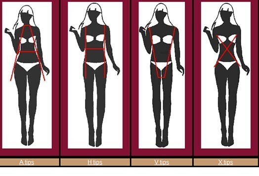 Raksturojums. Plati pleci un krūtis, sašaurināts viduklis un gurni. Sportiskas sievietes augums.