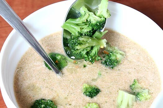 Zupu lej šķīvī un dekorē ar veselajiem, nesablendētajiem brokoļu „ziediņiem”.