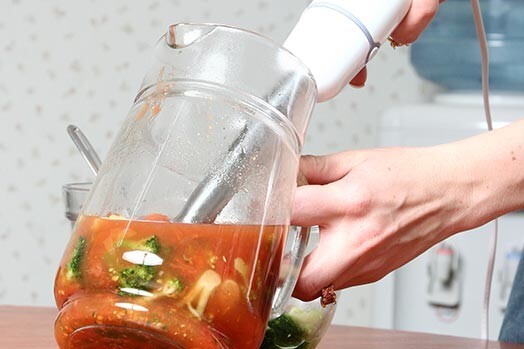 Daļu brokoļu atliek atsevišķā traukā, atlikušajiem pievieno tomātus un sablendē.