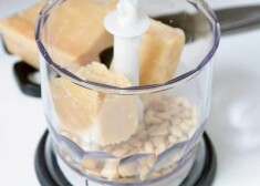 ciedru riekstus, cieto sieru, baziliku liek virtuves kombainā, un visu sasmalcina, līdz veidojas viendabīga masa. Pievieno nedaudz eļļas.