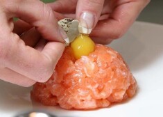 Sagriež lasi mazos gabaliņos. Lasi liek nelielā apaļā trauciņā, uz šķīvja to apgāž otrādi, lai lasis ieņemtu trauciņa formu. Laša vidū liek nevārītu paipalas olas dzeltenumu. Uz šķīvja lasim apkārt kārto kaperus, sasmalcinātus sīpolus, ciedru riekstus, zaļumus. Piedevām nedaudz uzlej olīveļļu.