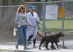 Holivudas zvaigzne Džūlija Robertsa pastaigājas ar suni Malibu piekrastē, sakopjot aiz sava četrkājainā drauga.