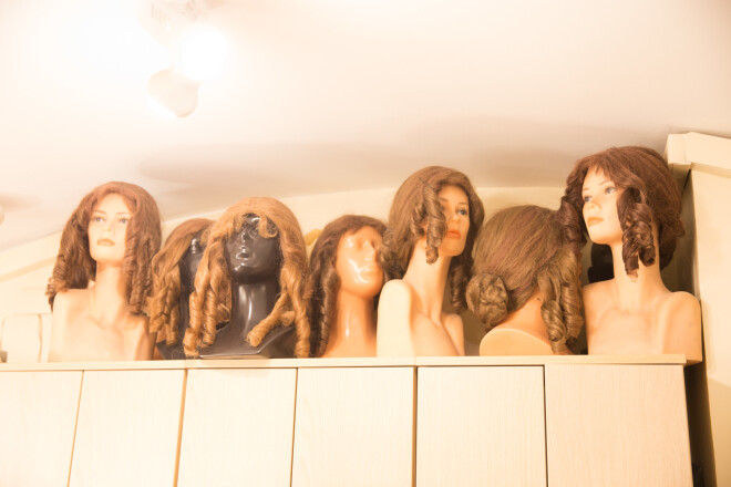 Telpas stūrī stāv parūkas. Izrādās, arī tās paredzētas baleta izrādēm. Lai parūku kārtīgi nostiprinātu, ir vesela tehnika – tiek izmantotas lentes, tīkliņi un sprādzes. Tiesa, pēdējā laikā parūkas esot jāvelk arvien retāk.