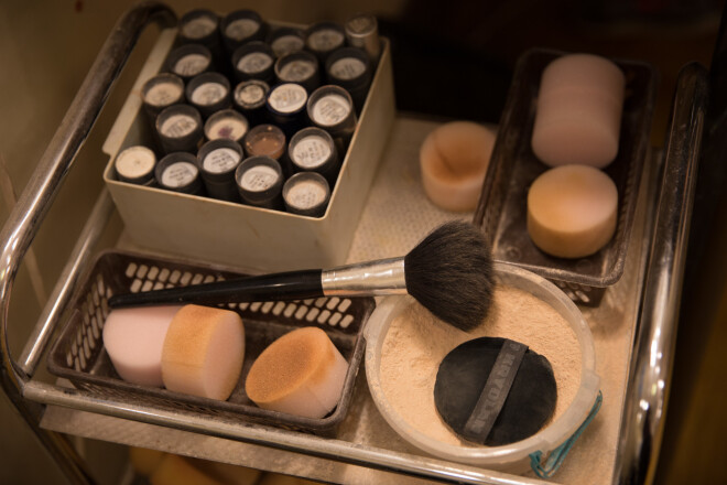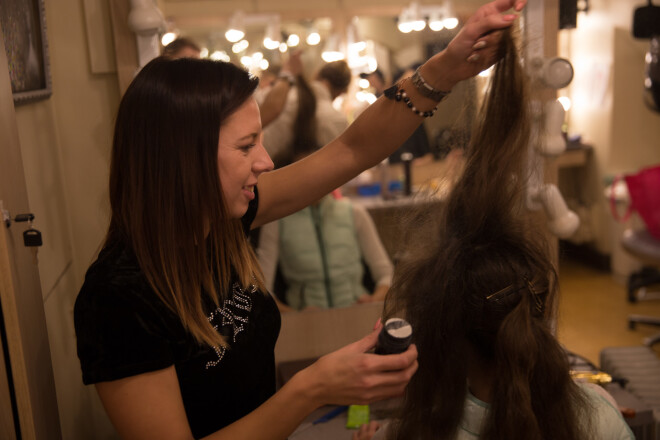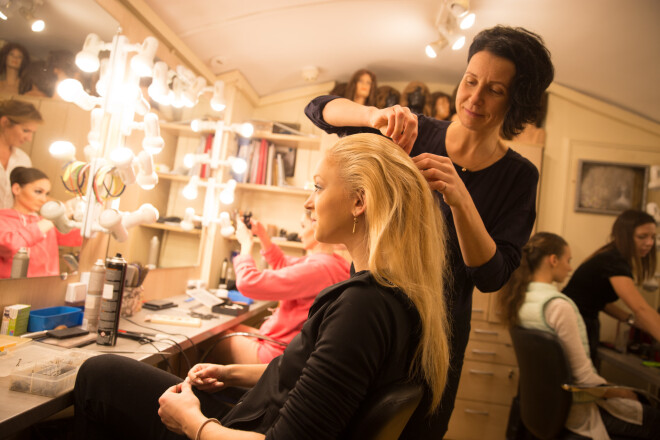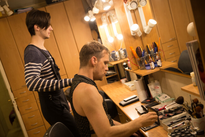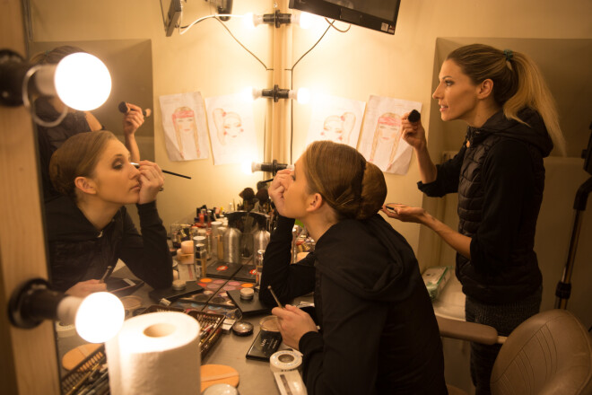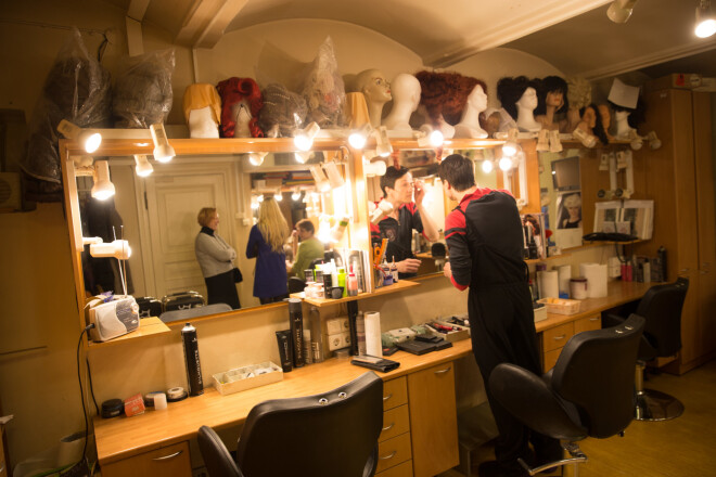 Annija Kopštāle: – Rēķināmies ar stundu – 30 minūtes grimam, 30 minūtes matiem, bet ne vienmēr sanāk tik precīzi. Gadās, ka šeit, grimētavā, kāds sēž arī divas minūtes pirms izrādes sākuma. Dažreiz jau sen esam gatavas, bet vēl desmit reizes ienākam paskatīties spogulī.