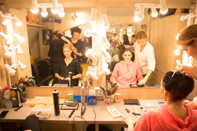 Tomēr par dīkstāvi meiteņu grimētavā nevar būt ne runas – balerīnas grimējas, gaida rindā pie friziera un labprāt atbild uz mūsu jautājumiem, cik nu tas atļauj, gatavošanās procesā.