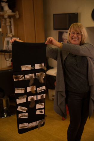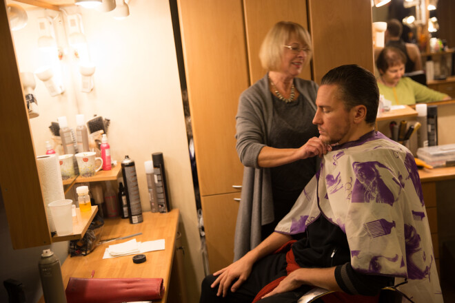 Friziere Ingrīda Bandeniece: – Mums katrai izrādei ir aktieru katalogs ar bildēm, kādu frizūru, bārdu un grimu vajag. Ja kādreiz aizmirstas, to var pašķirt un ātri sameklēt. Strādājam sadarbībā ar kostīmu mākslinieku, kurš dod ievirzi, kādu rezultātu vēlas. Viens ir frizūra un grims, bet būtiskas ir arī rotas. Tās piespraust, lai nenokrīt, dažreiz ir daudz sarežģītāk nekā izveidot frizūru.