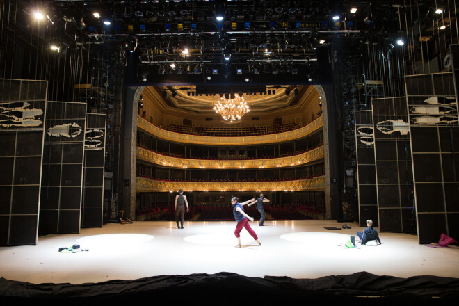 Uz skatuves lēnām parādās izrādes solisti, kuri, paslēpuši greznos tērpus zem siltiem treniņtērpiem un vilnas zeķēm, sāk iesildīties. Piedzīvojam unikālu mirkli, kurā vērojam gatavošanos izrādei no otras skatuves puses, ar pilnīgi tukšu skatītāju zāli fonā.