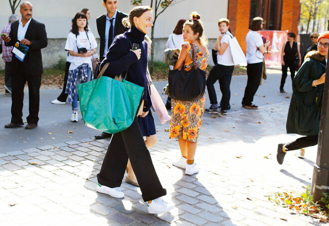 Humors un ironija – no plaši pazīstamajām plastikāta tirgus somām palienēt apdrukas mēteļiem, svārkiem un krekliem.