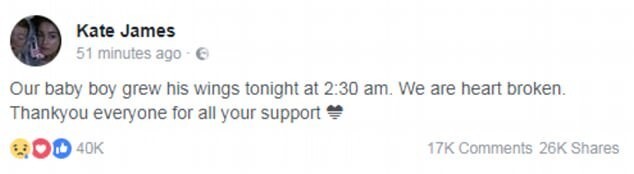 Mūsu zēns šodien 2.30 ieguva spārnus. Mūsu sirdis ir salauztas. Paldies visiem par atbalstu, soctīklos paziņoja Alfija māte Keita Džeimsa.