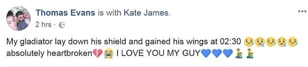 "Mans gladiators nolika savu vairogu un pulksten 2.30 no rīta ieguva spārnus," soctīklos paziņoja Toms Evans. "Mana sirds ir pilnībā salauzta. Es mīlu tevi, mans puika".