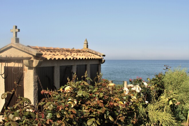 Mūsu izvēle izrādās ideāli pareiza. Esam tieši pie līča, kam apkārt ved skaidri nobultots pilgrimu ceļš. Pludmale gaida atpūtniekus, viss pagaidām kluss un rāms. Vietām redzam starp akmeņiem guļam saules kāros. Piesēžu uz apmales, jo zvana telefons.