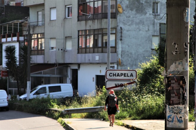 Ceļš cauri pilsētām ir neizbēgams. Tam vajag īpaši noskaņoties, pacensties atrast ko baudāmu, jo betona džungļi nav pilgrima draugs. Pirms iesoļot nākamajos, piesēžam āra balto galdiņu terasītē.