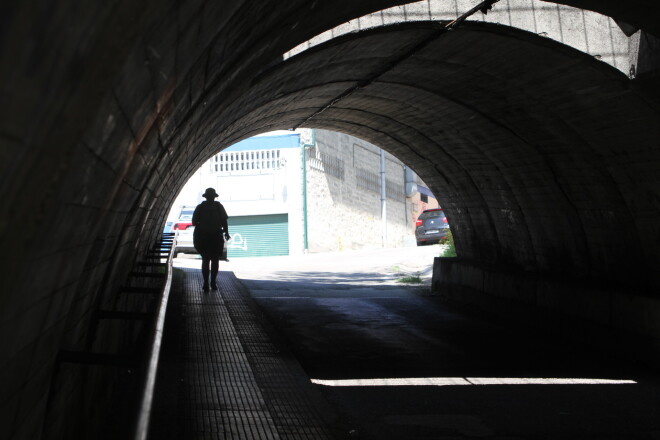 Pilsētu, kā pierasts, pametam stiprā tumsiņā. Vienīgie cilvēki, ko sastopam ir pilgrimi. Neprātīgas enerģijas uzlādēta, pa ielu nāk kāda dāma ceļotāja un uzrunā katru sastapto. Sētnieks berzē acis un nesaprot, ko no tā grib, vēl kāds vīrs skaļi nobļauj – No!