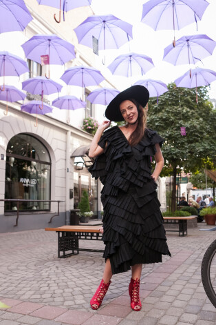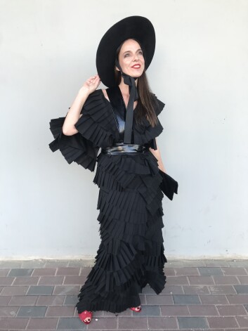 „Tas tika darināts tikai pirms dažām dienām un tapa pāris dienu laikā. Tērps transformējas trīs daļās. Varu valkāt kā garus svārkus, kā īsus, gan ar piedurknēm, gan bez vai arī ar jostu vai bez tās,” nosaka Skudriņa. Savukārt iespaidīgā platmale ir no stilistes un modes mākslinieces Ivetas Vecmanes pēdējās tērpu kolekcijas. „Gribēju pirkt pati, bet Vecmane tā gudri mani atrunāja no šīs skaistās cepures iegādes. Viņa man pilnīgi neļāva to nopirkt! Izrādās, manas draudzenes jau bija šo cepuri iegādājušās un man to uzdāvināja,” stāsta Gundega.