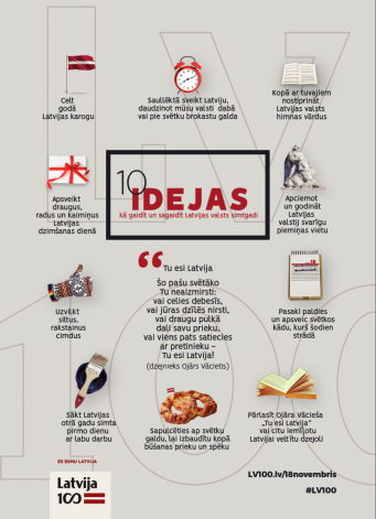 Pēc dažām dienām, 18. novembrī, ar plašu programmu tiks svinēta Latvijas valsts proklamēšanas 100. gadadiena. Daudzveidīgs pasākumu klāsts valsts simtgades svētku programmā tiek piedāvāts Rīgā, visā Latvijā un pasaulē, kur Latvijas vārdu godinās plaša diplomātiskā programma. Gaidīt un sagaidīt nozīmīgo dienu, radot svētku noskaņu, ar kuru doties uz kādu no svinīgajiem pasākumiem, palīdzēs 10 idejas Latvijas dzimšanas dienai.