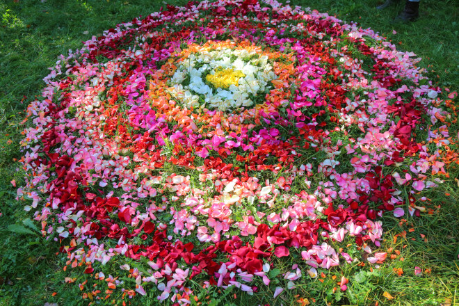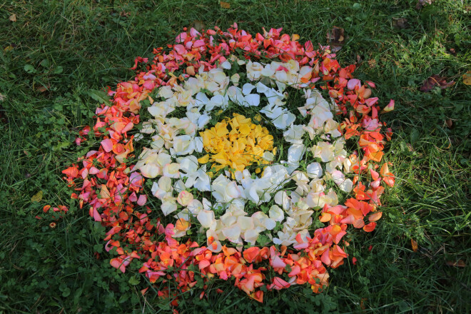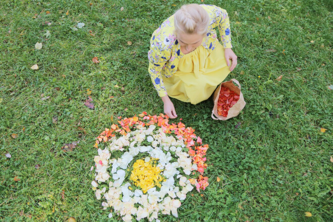 No balkona pavērās skats uz vienmuļu zaļu ielociņu, un sapratu, ka man vajag sev sagādāt prieku. “Ir ideja!” teicu abām meitām, un mēs, savākušas visas mājās pieejamās ziedlapiņas, devāmies lejā veidot mandalu. Mums ātri pievienojās citi bērni, kāda sieviete, novērtējusi topošo brīnumu, iesaucās: “Manam vīram šodien ir dzimšanas diena – ja drīkst, pateikšu viņam, ka es to uztaisīju!”