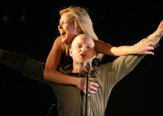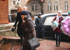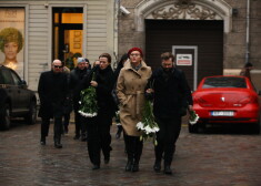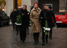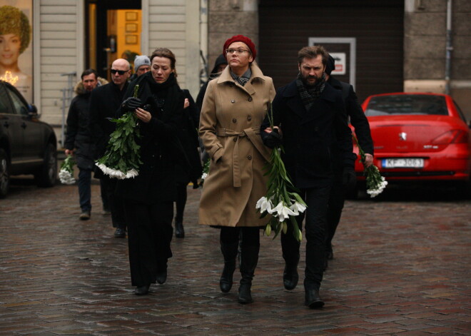 Dailes teātra aktrise Kristīne Nevarauska un lietuviešu režisors Rolands Atkočūns režisora Valda Liepiņa bērēs 2017. gada 12. decembrī.