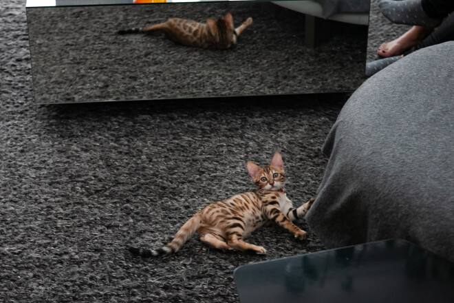 „Bleika, bengāliešu šķirnes kaķenīte, kas mūsmājās ienāca pirms mēneša, lido kā vāvere uz visām pusēm. Aizkaros iepriekšējais kaķis jau paspēja pakarāties, to man vairs nav žēl. Dīvāns mums kādreiz bija ādas, tagad tas ir auduma un pielāgots kaķim. Dzīva māja ir ar švīkām, un, ja vajag, var pārkrāsot sienu!