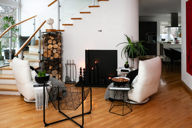 „Mums ļoti patīk atklātā uguns. Daudz kurinām kamīnu, jo īpaši ziemā. Arī Mārtiņam ļoti patīk uguns – sēžot pie tās, viņš vislabāk relaksējas un atpūšas,” stāsta Ieva. „Bet pirms gada mūsu iepriekšējais kaķis Kato izdomāja, ka kamīns ir piemērota vieta, kur viņam nokārtoties.