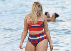 Apaļīgā modele Iskra Lorensa demonstrē jaunāko peldkostīmu modi