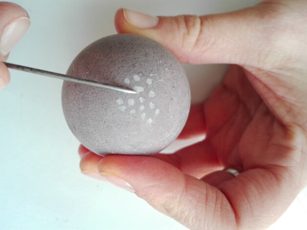 ■ Novārījumā nokrāsotai olai ar asu adatu vai īlenu nokasi krāsas kārtiņu, veidojot rakstu.