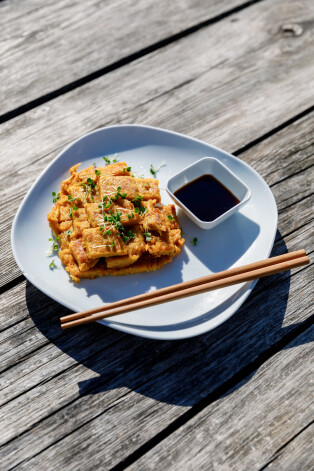 5. Pasniedz sagrieztu nelielos gabaliņos un pārkaisītu ar zaļumiem. Ēd, pamērcējot sojas mērcē.