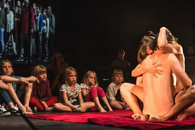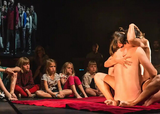 Izrādē bērni vēro Ādama un Ievas mīlas aktu. Situāciju komentē Latvijas speciālisti
