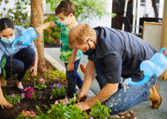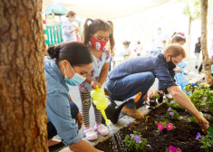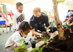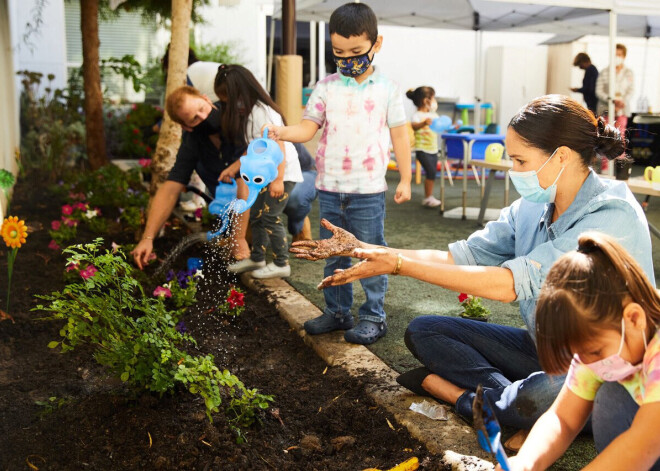 Princis Harijs un Megana Mārkla stāda puķītes kopā ar bērndārzniekiem Losandželosā