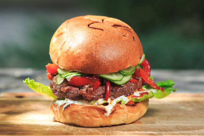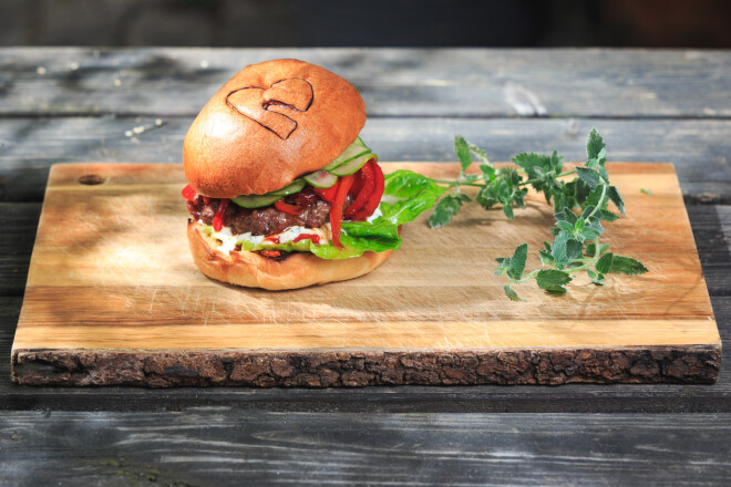 Liellopa gaļas burgers ar karamelizētu papriku, svaigi marinētām gurķu strēmelēm un vīriešu zapti