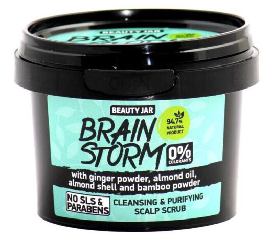 Beauty Jar BRAINSTORM galvas ādas skrubis. Sastāvā esošās mandeļu miziņas kopā ar bambusa un ingvera pulveri efektīvi attīra galvas ādu un uzlabo asinsriti. Mandeļu eļļa baro ādu un dziedē sīkas brūces. Maksā 2,95 EUR.