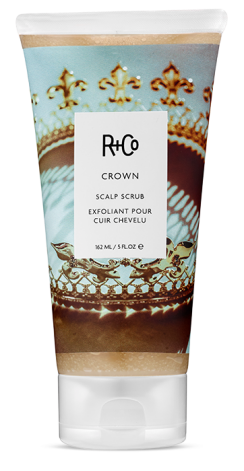 R+CO Crown Scalp Scrub attīrošs skrubis matiem. Sastāvā esošais koalīns absorbē taukvielas, palmu sēklu pūderis veic maigu attīrīšanu, salicilskābe aktivizē asinsriti, uzlabojot matu folikulu veselību. Maksā 34,99 EUR.
