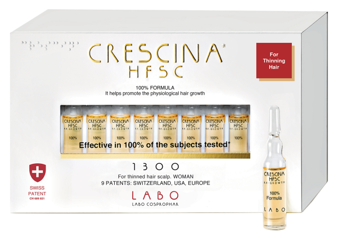 CRESCINA HFSC ampulas. Sastāvā esošās aminoskābes, minerālvielas, kā arī cilmes šūnu aktivators un olbaltumviela glikoproteīns pamodina snaudošos matu folikulus, atjaunojot matu struktūru. Novērš matu izkrišanu, stimulē to augšanu. Maksā 117 EUR (10 gab.).