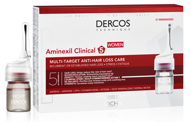 Vichy Dercos Aminexil ampulas matiem. Satur aktīvo vielu aminexil ar pierādītu klīnisko efektivitāti pret matu izkrišanu un piecu aktīvo sastāvdaļu kompleksu, kas samazina matu izkrišanu un stimulē stiprāku matu augšanu. Maksā 59 EUR (21 gab.).