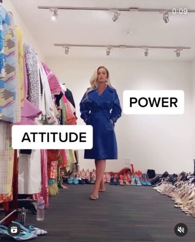 Savam amizantajam video šova “American Idol” žūrijas pārstāve bija izvēlējusies arī garu blondu matu parūku, bet kājās apāvusi augstpapēžu iešļūcenes ar kniedēm. Keitijai pa istabu soļojot kā pa mēli modes skatē, uz ekrāna redzami arī tādi vārdi kā “stils” un “pārliecība”.