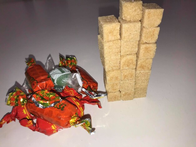 Cukura daudzums būs atkarīgs no konfekšu veida, bet tas variē aptuveni no 50 līdz 80 gramiem uz 100 gramiem produkta. Tas nozīmē, ka vismaz puse no konfektes ir tīrs cukurs! Vienā tējkarotē ir 5 grami cukura. Rēķiniet paši – tātad vismaz 10-16 tējkarotes cukura tikai 100 gramos pakas satura! Bet pakā taču ir krietni vairāk.