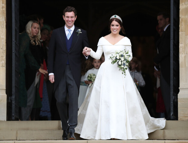 Princese Eiženija pie altāra Svētā Džordža kapelā Vindzorā devās dizaineru Pītera Pilotto un Kristofera De Vo darinātā kāzu kleitā. Viņa jāvārdu savam izredzētajam Džekam Brūksbenkam teica 2018. gada oktobrī.