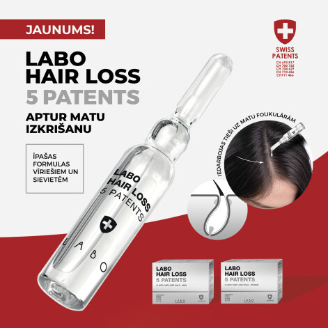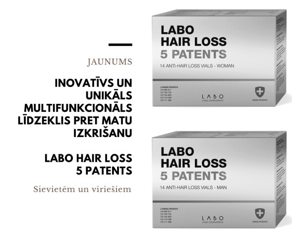 Viens no iespējamajiem risinājumiem ir JAUNUMS Latvijas tirgū - Labo Hair Loss 5 Patents - inovatīvs un unikāls līdzeklis pret matu izkrišanu. Eksperti jau augstu novērtējuši tā lieliskos rezultātus.