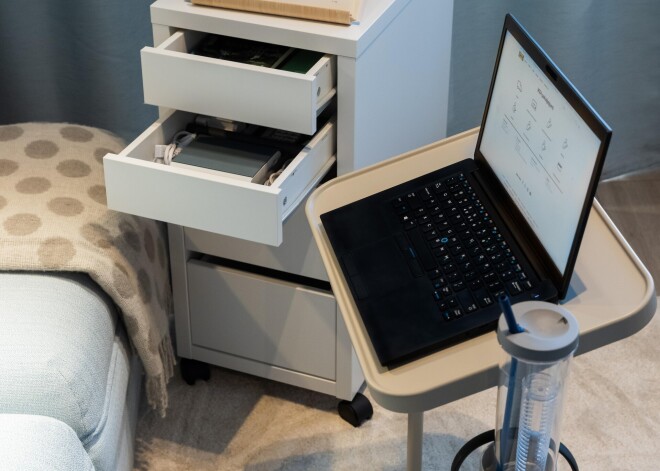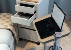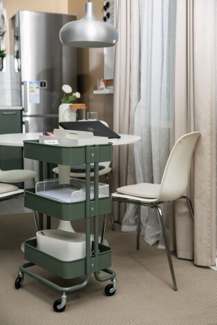 “Ar šādiem ratiņiem virtuvē iekārtoto darba vietu var ātri un ērti pārvērst atpakaļ par ēdamgaldu, un klēpjdatoru, dokumentus un lādētājus var veikli pārvietot tur, kur nepieciešams. Ratiņi ar kārtīgām kastēm un organizatoriem iedvesmos produktīvam darbam. Starp citu, arī ērtam un ergonomiskam krēslam atradīsies vieta pat nelielā mājoklī – vakarā to vienkārši var izmantot kā sēdvietu pie ēdamgalda,” uzskata interjera dizaineris.