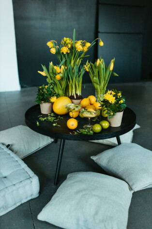 Vienkāršs, bet ļoti efektīgs veids, kā ātri uzburt pavasari un sauli telpā ir, izveidojot kompozīciju zaļā un dzeltenā krāsā. Izmanto pavasara ziedus – grieztos un podiņos. Labi iederas arī dzeltenas krizantēmas. Kompozīciju papildini ar atbilstošas krāsas augļiem – citroniem, laimu, meloni. Ļauj vaļu iztēlei!