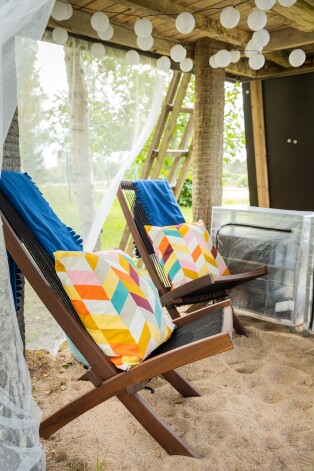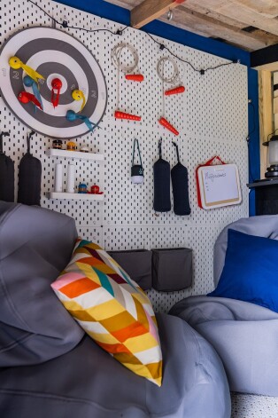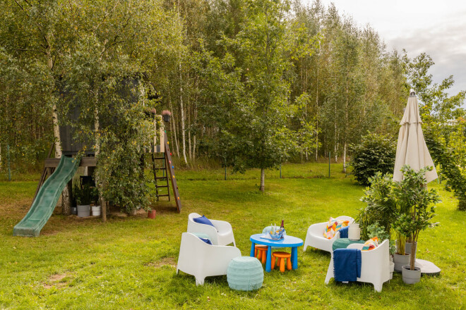 Pieliekot vēl dažus krāsainus pufus un bērnu mēbeles, izdevies radīt dzīvespriecīgu un aicinošu kombināciju atpūtai, spēlēm, piknikam vai nesteidzīgām sarunām. Tā kā zona ir atsevišķi no rotaļu namiņa, pieaugušie var ērti pieskatīt bērnus, netraucējot tiem spēlēties.