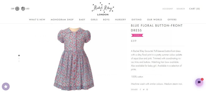 Karaļnama fani jau izdibinājuši, ka Šarlotes kleita ar īsajā piedurknēm ir bērnu apģērbu zīmola “Rachel Riley” darinājums un maksā 59 sterliņu mārciņas. Šis kleitas modelis pieejams ne tikai tumši zilā krāsā (kas jau vairākās vecuma grupās ir izpārdots), bet arī ar ziediem uz gaiši zila un violeta fona.