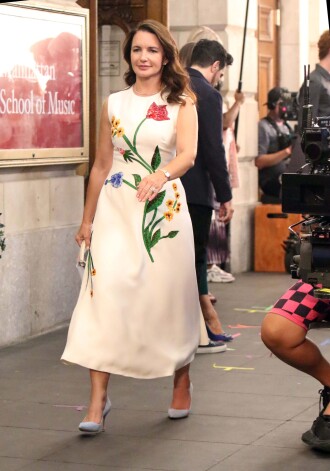 Ikonisks un pat tradicionāls Kerijas stils – kupla un nedaudz ekscentriska kleita no Carolina Herrera, bet ap vidukli apjoztā josta ir vintāža un bijusi redzama seriāla filmas 1. daļā.