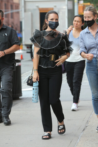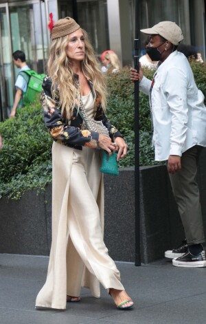Velns ir detaļās – Kerijai Bredšovai stila odziņa ir efektīga cepure un modīgais divu somiņu salikums. Līdz ar to pārējais ir lakonisks – vintāžas Claude Montana zīda kombinezons un Dries van Noten bleizeris.
