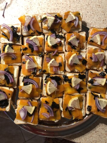 Maizītei uzsmērē margarīnu, pa virsu liek “burkānlasi”, smalki sagrieztu sīpolu, citrona gabaliņu un piparus garšai.