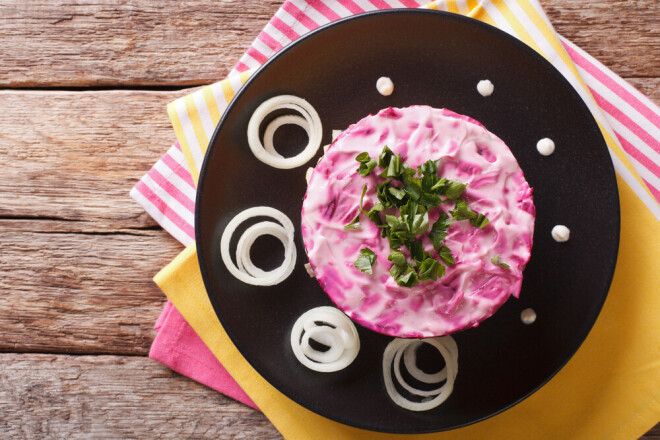 5. Cepamajā formā (kam noņemamas malas) liek kārtām – kartupeļus pārklāj ar majonēzi, pa virsu liek nori lapu, tad – vegānu siļķi, virs tās – majonēzi un veselu nori lapu, tad bietes, pārsmērē ar majonēzi, tālāk – vegānu olas, pārklāj ar majonēzi un nori lapu, pabeidz ar bietēm, pārklāj ar majonēzi.