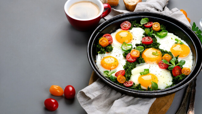 5. Kad tomāti apcepušies, pa virsu uzsit olas. Cep ar vāku. Tas, cik šķidram jābūt dzeltenumam, pēc jūsu izvēles. Tik ilgi arī cepsiet.