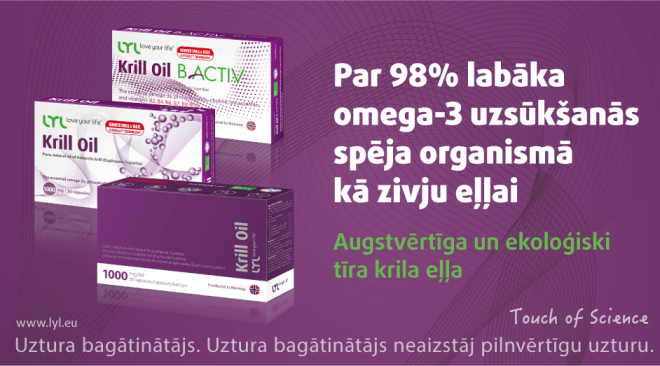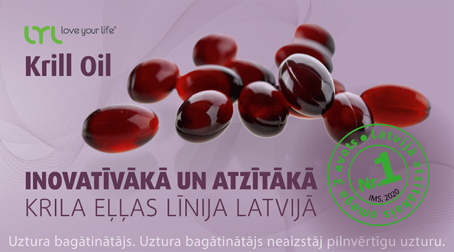 Jau vairāku gadu garumā iepriekš minētā krila nozvejas uzņēmuma Aker Biomarine™ krila eļļu ir iespējams iegādāties mūsu valsts aptiekās un internetaptiekās, pateicoties pašmāju farmācijas zīmolam LYL love your life® - LYL Krill Oil ir 100% dabiska krila eļļa, iegūta no Antarktiskajiem kriliem, kas zvejoti pasaules tīrākajos ūdeņos Atlantijas okeānā. Zīmīgi, LYL Krill Oil ir bez specifiskās zivju smaržas, pēcgaršas un atraugas. Ideālais risinājums atrasts – parūpējies par savu ādu no iekšienes ar LYL Krill Oil.